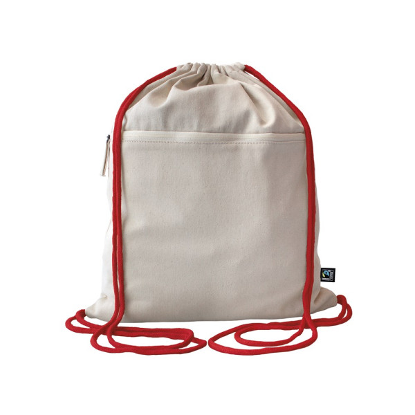Material Rucksack/Kordeln: 100% Baumwolle Grammatur: ca. 200 g/m² Eigengewicht: ca. 185 g Rucksack/Reißverschluss: natur Größe: ca. 46 x 38 cm Reißverschluss: ca. 38 cm Länge Ausführung: - Kettelnaht innen - Kordelfarbe: rot Zertifikate: Oeko-Tex Standard 100, Fairtrade