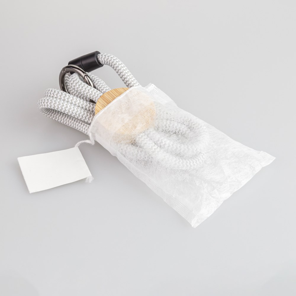 Nachhaltiges Lanyard aus recyceltem PET mit Bambus-Slider. Ideal für Events und Werbeaktionen. Gravurfähiger Holz-Slider und Schlüsselring aus Metall. In vier Farben verfügbar oder individuell nach PANTONE®.