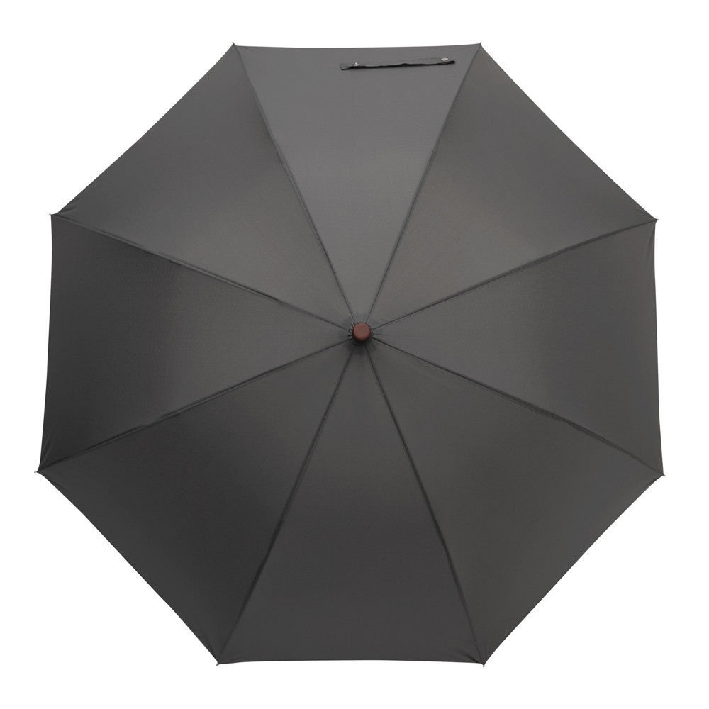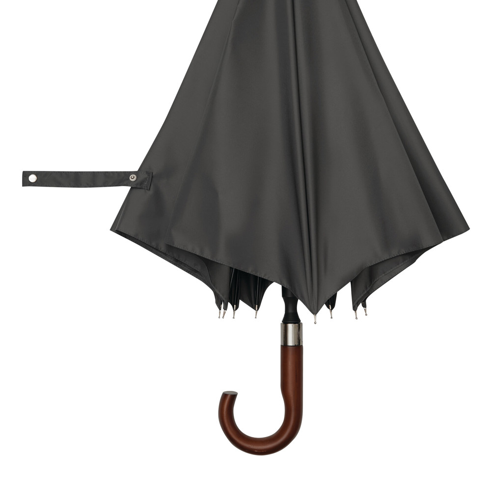 Automatik-Golfschirm EARL: schwarzer Metallstock, Fiberglasspeichen und Metalltips, Holzrundhakengriff und -spitze, Griff mit integrierter Automatik-Auslösetaste, hochwertige Polyester-Pongee-Bespannung, Schließband mit Druckknopf