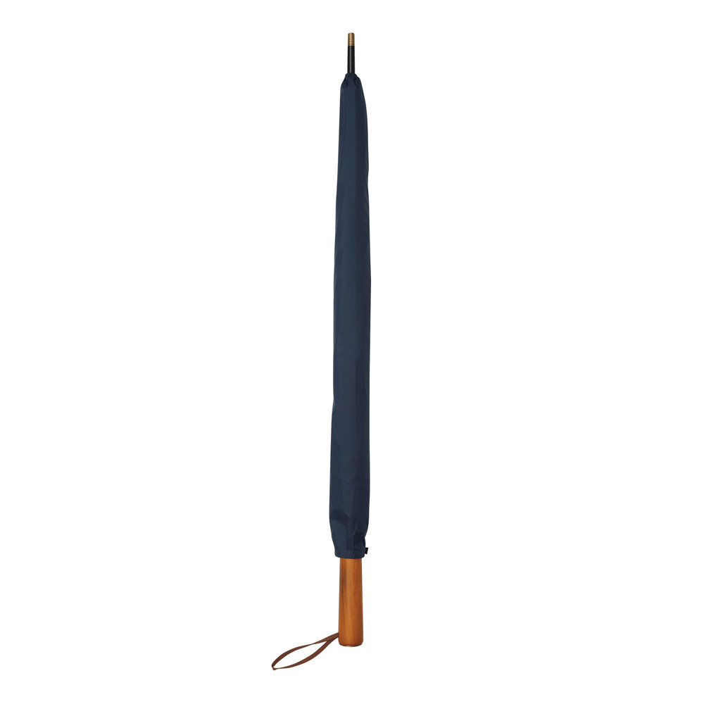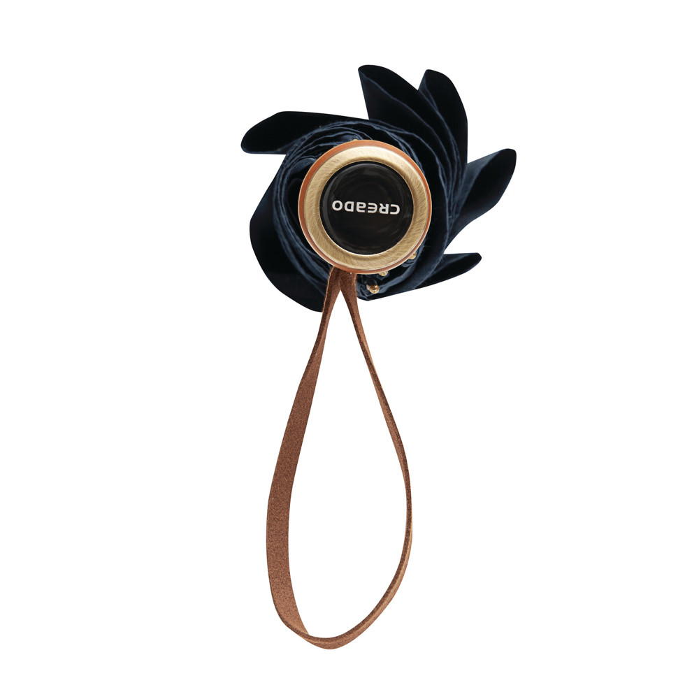 Automatik-Stockschirm POLKA: schwarzer Metallstock, Fiberglasspeichen und Metalltips, gerader Holzgriff mit messingfarbener Automatik-Auslösetaste, Griff mit „CREADO“-Doming, hochwertige Polyester-Pongee-Bespannung und -Hülle, Schließband mit Druckknopf