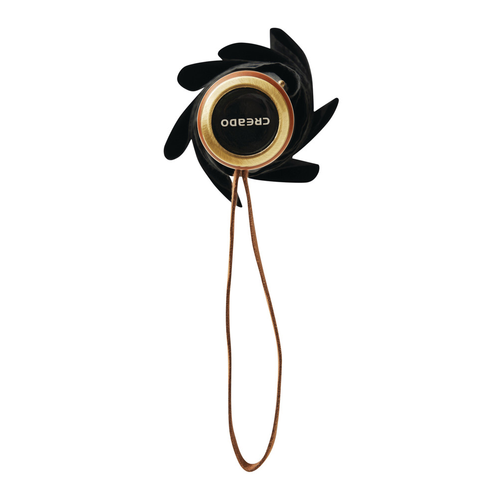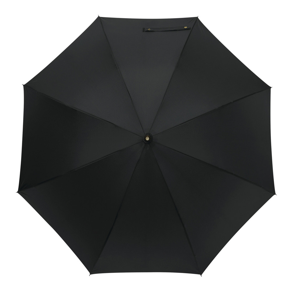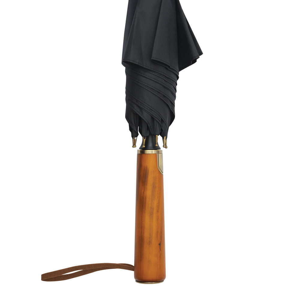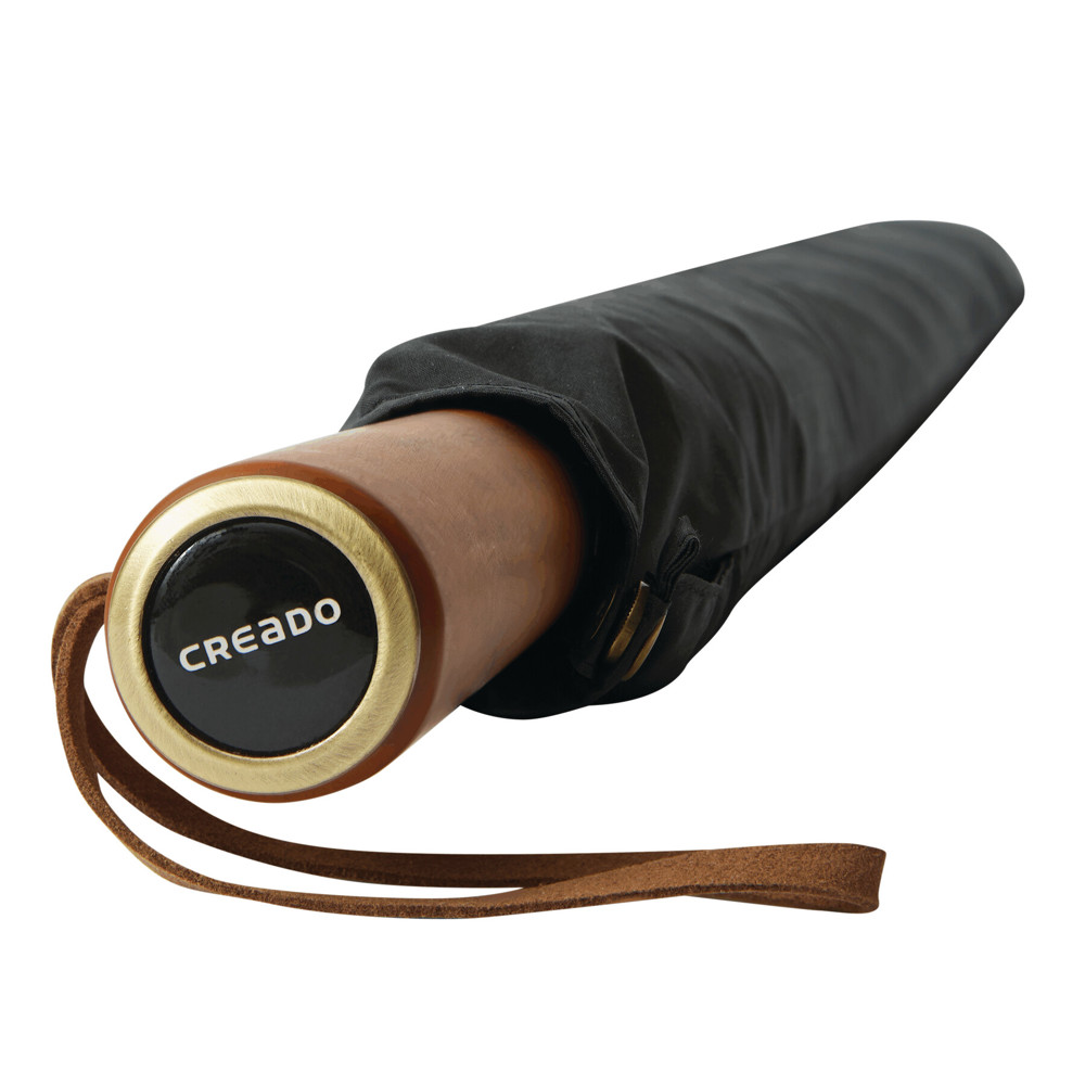 Automatik-Stockschirm POLKA: schwarzer Metallstock, Fiberglasspeichen und Metalltips, gerader Holzgriff mit messingfarbener Automatik-Auslösetaste, Griff mit „CREADO“-Doming, hochwertige Polyester-Pongee-Bespannung und -Hülle, Schließband mit Druckknopf