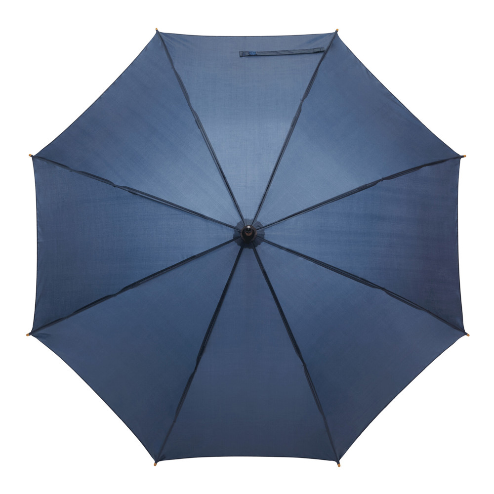 Automatik-Holzstockschirm JAZZ: Fiberglasspeichen, Holztips und -Rundhakengriff, Polyester-Bespannung aus recycelten Kunststoffen / RPET, Schließband mit Klettverschluss