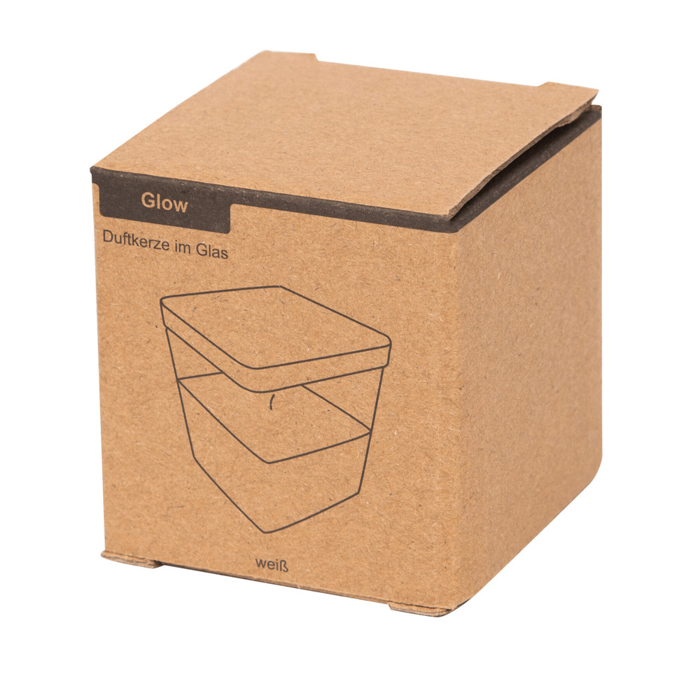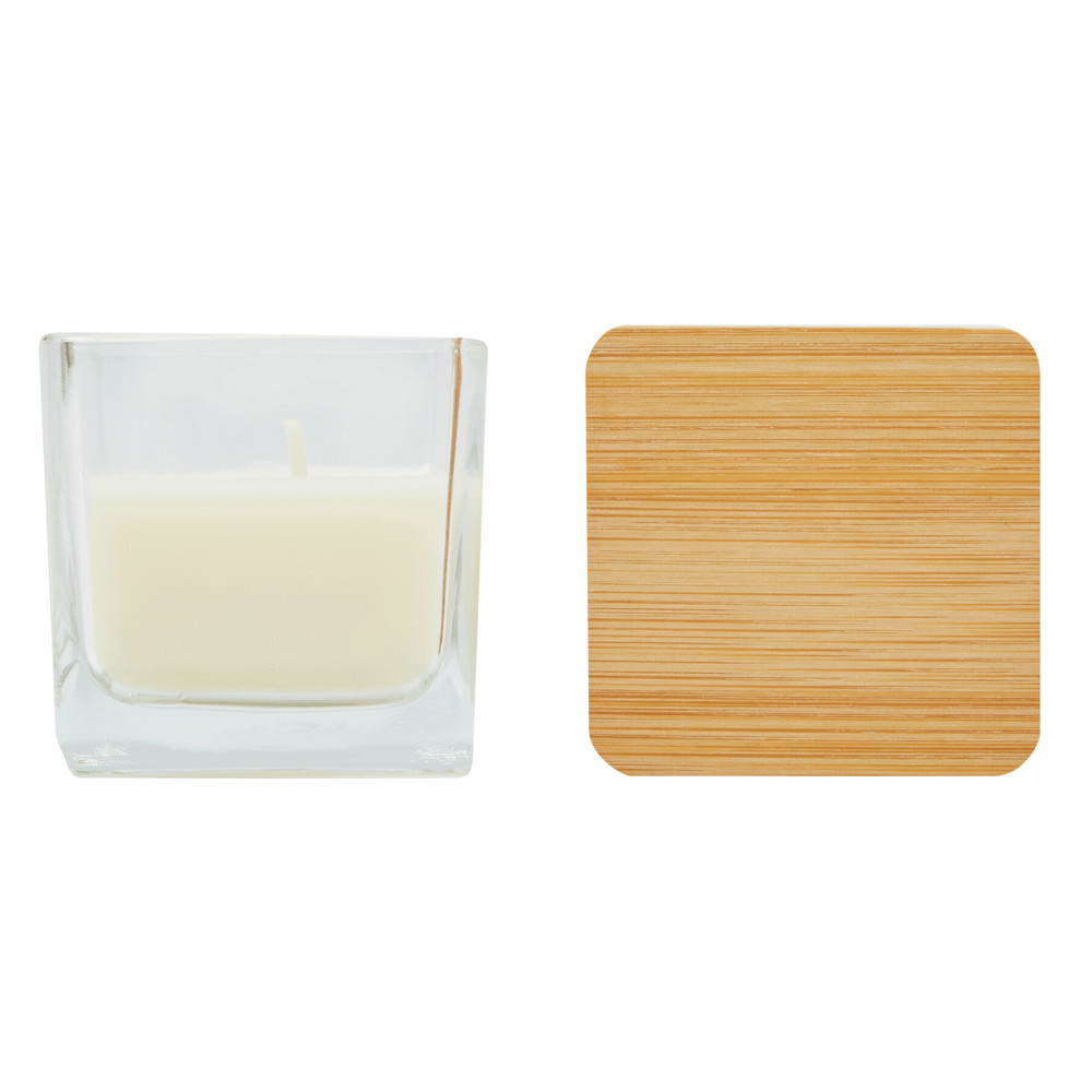 Duftkerze GLOW: in quadratischem Glas, farbiges Wachs mit Vanille-Duft, abnehmbarer Bambusdeckel mit Silikon-Dichtring, Brenndauer ca. 8 Stunden, in Box