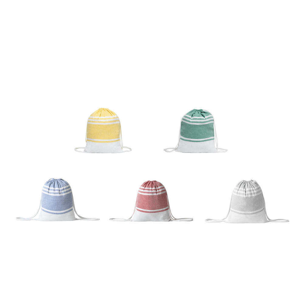 Großes Strandtuch / Saunatuch SUN & STEAM: mit weißen Streifen und Fransen, in farbig passender Tasche mit Kordelzug