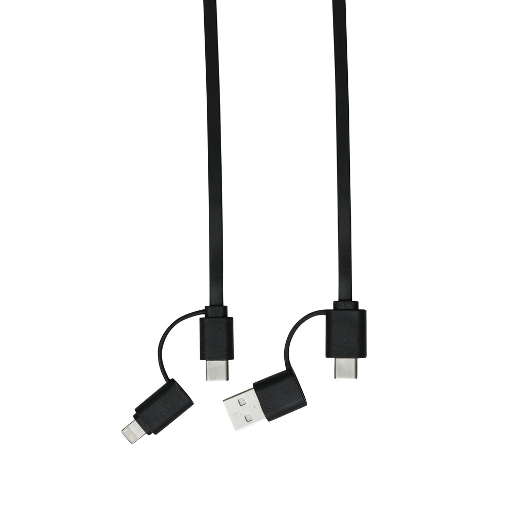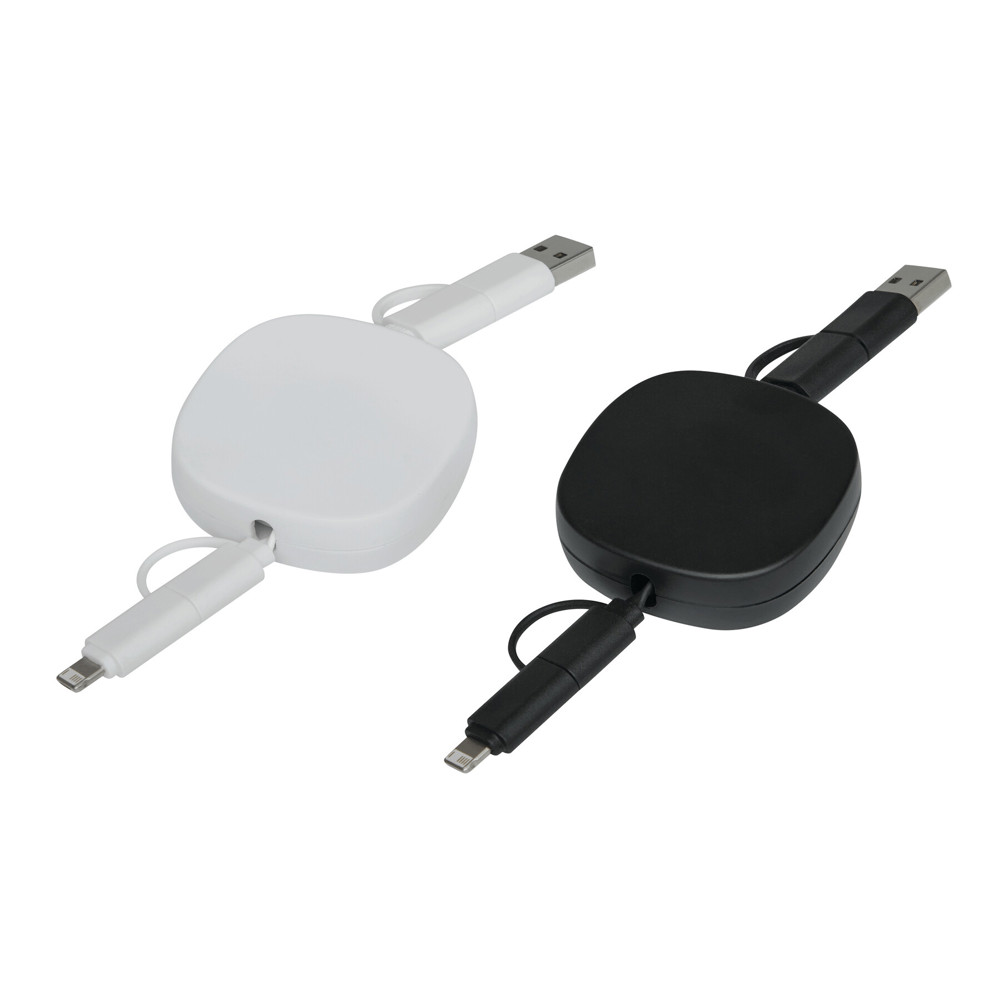 Lade- und Datenkabel TRANSFER SQUARE, aufrollbar (Länge: ca. 92 cm): zum Aufladen von Smartphones, USB-betriebenen Geräten und Laptops (65 W Leistungsübertragung) sowie zum Übertragen von Daten, inkl. 2 Ladesteckern (USB Typ C, Kombistecker Micro-USB/Lightning®), kombinierter USB Typ A / Typ C Eingangsstecker, in Box