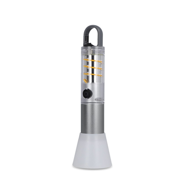 Wiederaufladbare Taschenlampe aus recyceltem Aluminium mit einem 1200-mAh-Akku, einer 10-W-LED und einer Glühfadenlampe, die bis zu 400 lm Helligkeit bietet. Die LED-Lichtmodi umfassen hoch, mittel und Blitz, während das Glühfadenlicht über einen Einschalt- und Blitzmodus verfügt. Ausgestattet mit einem integrierten Clip auf der Rückseite und einer Zoomfunktion für den vielseitigen Einsatz.