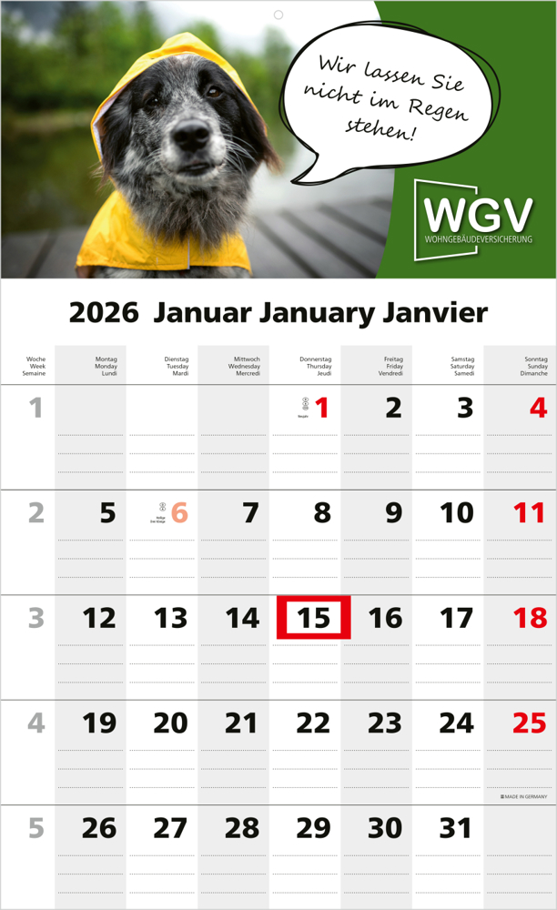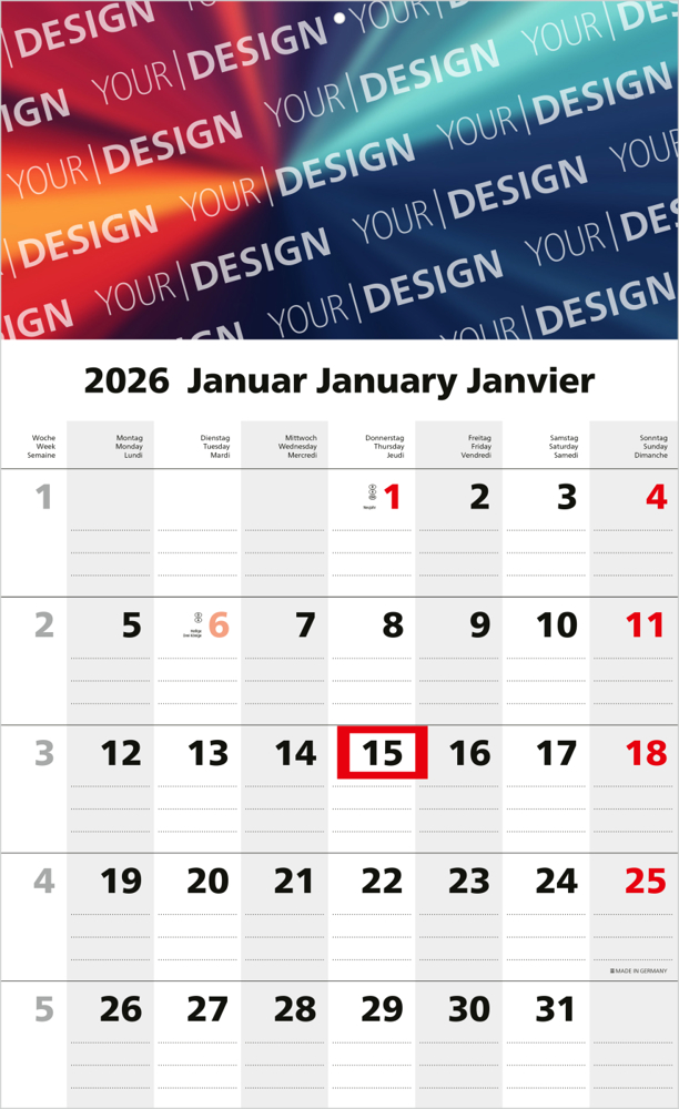 Der Solo 1 Bestseller überzeugt als praktischer 1-Monatskalender mit klarer Linienführung für Eintragungen und einer großzügigen Werbefläche. Perfekt geeignet für Unternehmen, die Wert auf hochwertige Werbemittel und Funktionalität legen. • Format: 300 × 490 mm gesamt; 300 × 350 mm Kalendarium • Kalendarium: Deutsch 3sprachig D/GB/F hellgrau/rot • Ausstattung: Datumsschieber rot • Werbefläche: am Kopf • Druck: 4C-Quality Digital inklusive