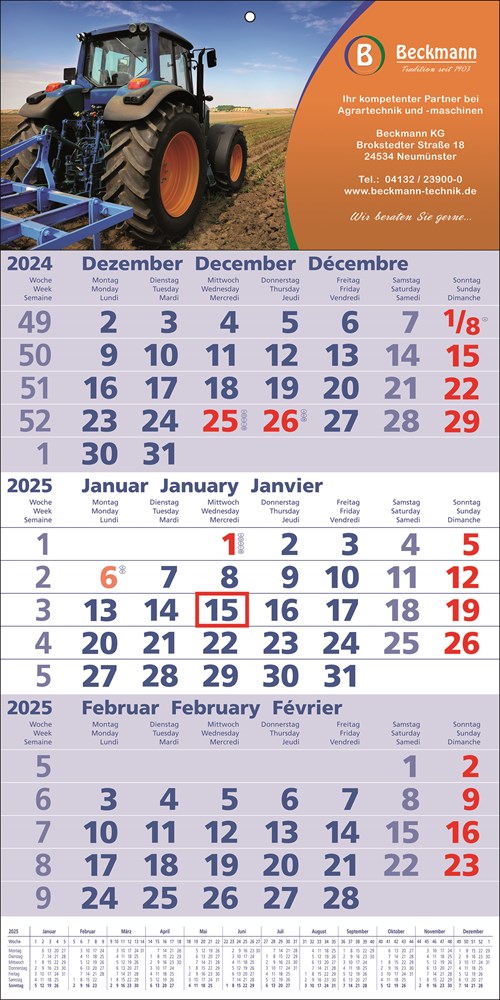 Papierwandkalender mit 3 Monaten auf einer Seite mit Jahreskalendarium auf jedem Kalenderblatt, 3-sprachig (D,GB,F) dt. Feiertage