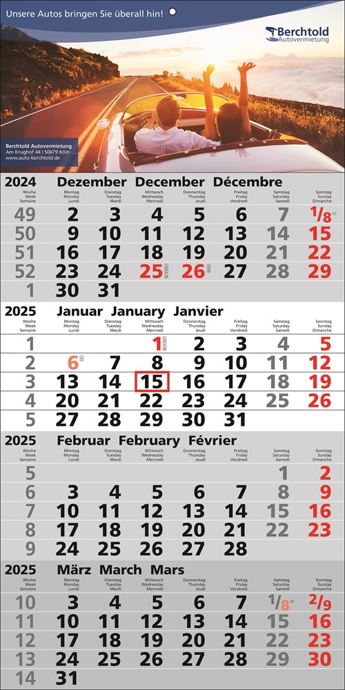Papierwandkalender mit 4 Monaten auf einer Seite, 3-sprachig (D,GB,F), deutsche Feiertage