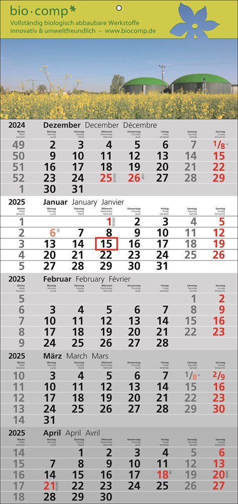 Papierwandkalender mit 5 Monaten auf einer Seite, 3-sprachig (D,GB,F), deutsche Feiertage