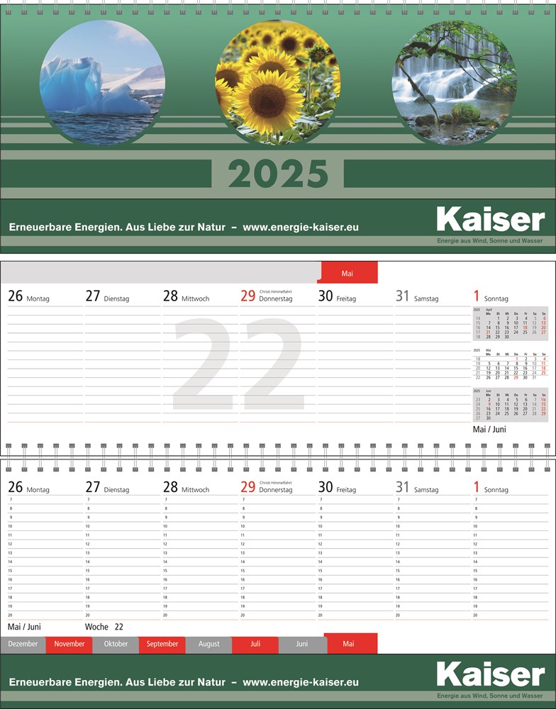 Tischquerkalender mit 3 Monatsübersicht mit Monatsregister, gestanzt, 1 Woche auf 2 Seiten, Terminuhrzeiten von 7-20 Uhr , 1-sprachig deutsch 128 Seiten