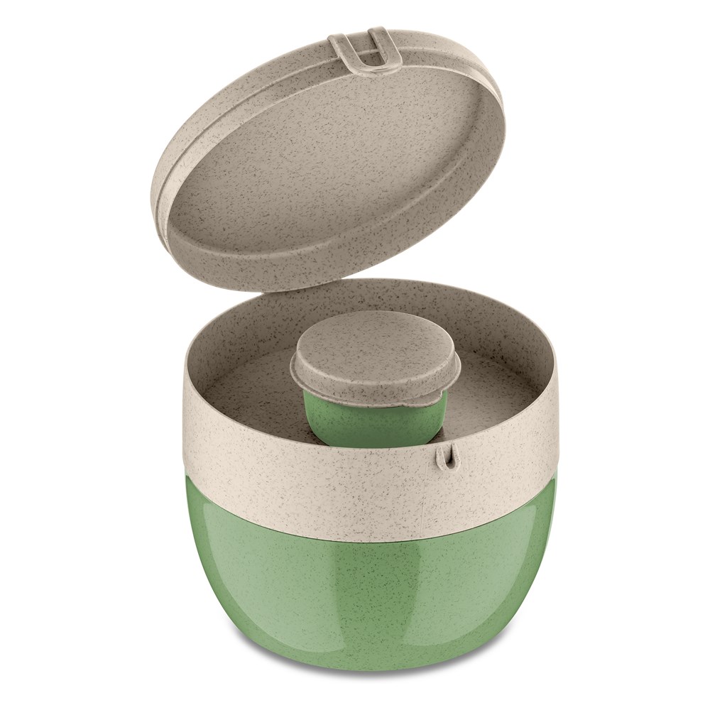 Die perfekte Box für alle Meal Prepper. Die kompakte Dose ist ideal für kleine Nudelgerichte, Bowls, Salate und Oatmeals. Das Oberteil bietet genügend Stauraum für Obst oder Nüsse, die kleine Minidose ist für Gewürze, Dressings oder Honig gedacht. Alle Zutaten werden in der Dose sauber voneinander getrennt und bleiben appetitlich bis zur Mahlzeit. - Der nachhaltige Markenartikel – made in Germany. Für unsere Kollektion verwenden wir vorwiegend biozirkuläre Kunststoffe, die aus gebrauchten Speiseölen recycelt werden.