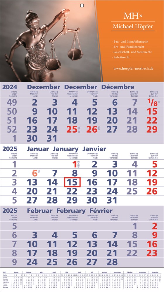 Papierwandkalender mit 3 Monaten auf einer Seite mit Jahreskalendarium auf Fußleiste, 3-sprachig (D,GB,F) dt. Feiertage