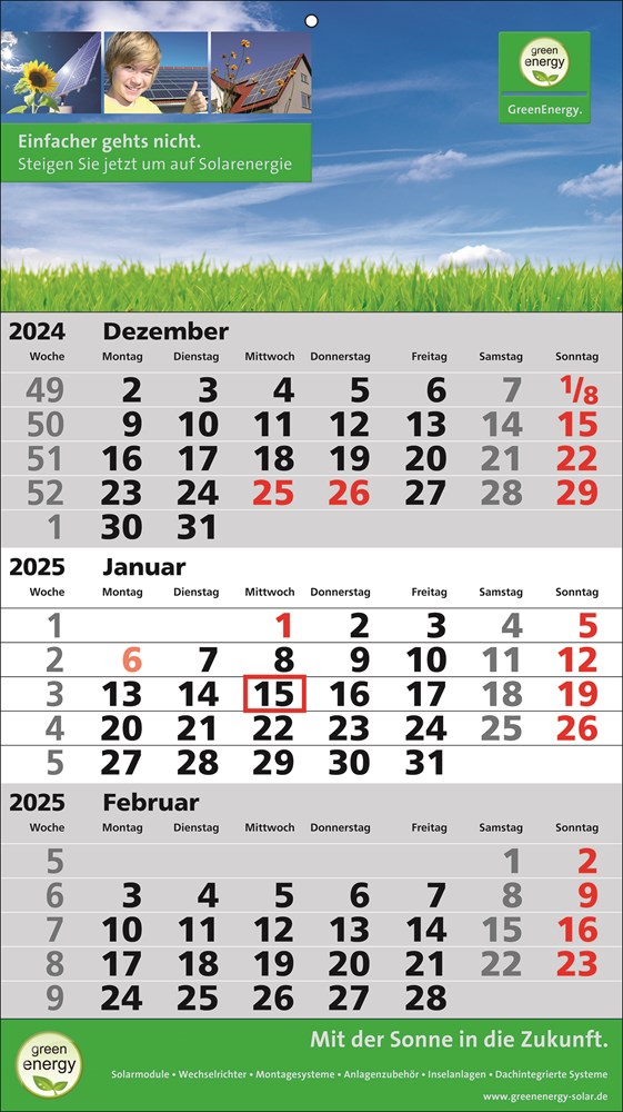 Papierwandkalender mit 3 Monaten auf einer Seite + Werbemöglichkeit auf Fußleiste, deutsch-sprachig mehr