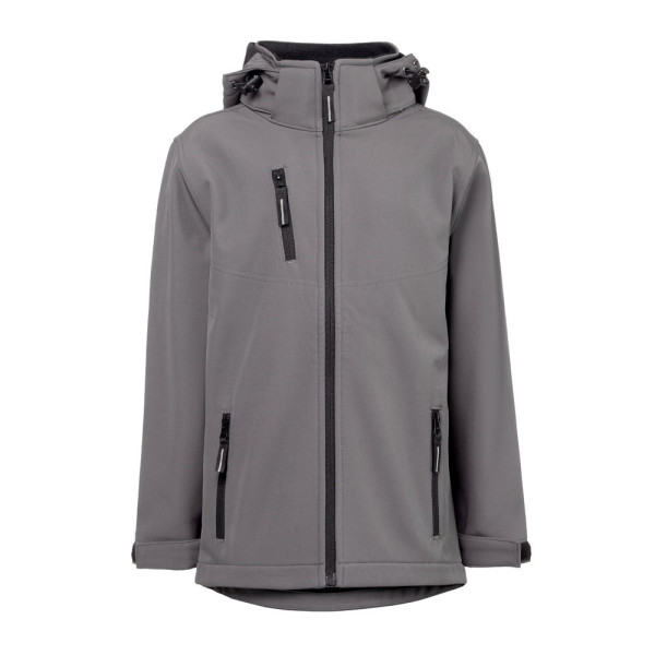 Sofschelljacke für Kinder aus 96% recyceltem Polyester-Softshell und 4% Elastan (280 g/m²), mit zwei Schnürsenkeln und wasserabweisendem Futter. Mit Fleece gefütterte Jacke (100% recyceltes Polyester) mit 2 Fronttaschen und einer schrägen Brusttasche, beide mit Reißverschluss. Abnehmbare und verstellbare Kapuze mit Kordelzug und selbstklebendem Reißverschlussband zur Anpassung an den Kragen. Vordere Öffnung mit YKK®-Reißverschluss - eine Marke, die moderne Ausrüstung und hohe Qualitätskontrolle einsetzt. Verstellbare Manschetten mit selbstklebendem Verschlussband. Abgerundeter unterer Rücken. Größen: 4, 6, 8, 10, 12