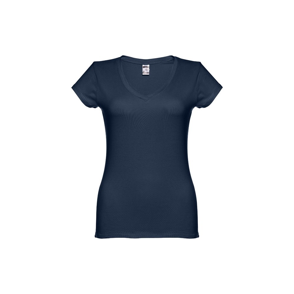 Damen T-Shirt aus 100% Strickjersey und Baumwolle (150g/m²) mit kardiertem Baumwollfaden, tailliert, überlapptem V-Ausschnitt, Verstärkungsband, Jersey-Kragen und Doppelnaht an Ärmeln und Saum. Bei den Farben 194, 195 und 199 bestehend aus 60% Baumwolle und 40% Polyester. Größen: S, M, L, XL, XXL