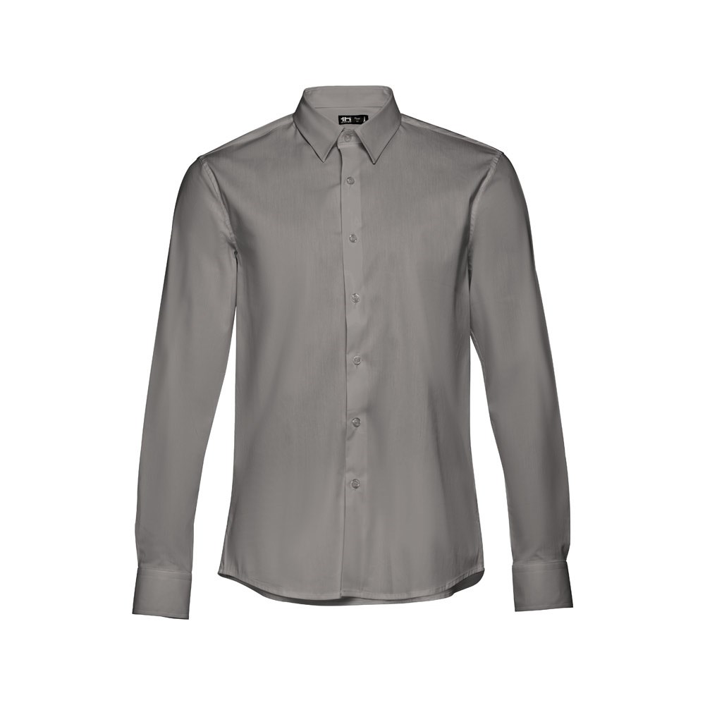 Herren langarm Popeline Hemd aus 68% Baumwolle, 28% Polyamid und 4% Elasthan (115g/m²) mit einer Knopfleiste mit 7 farblich abgestimmten Knöpfen, verstellbaren Manschetten mit 2 Knöpfen und 1 Rückenfalte. Größen: S, M, L, XL, XXL