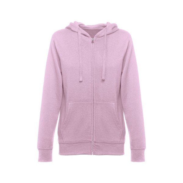 Damen Sweatjacke aus 50% Baumwolle und 50% Polyester (320g/m²) mit Reißverschluss und gefütterter Kapuze mit Kordelzug. Kardiert mit 2 Kängurutaschen, einem verdeckten Kunststoffreißverschluss und einem gerripten Bund. Größen: S, M, L, XL, XXL