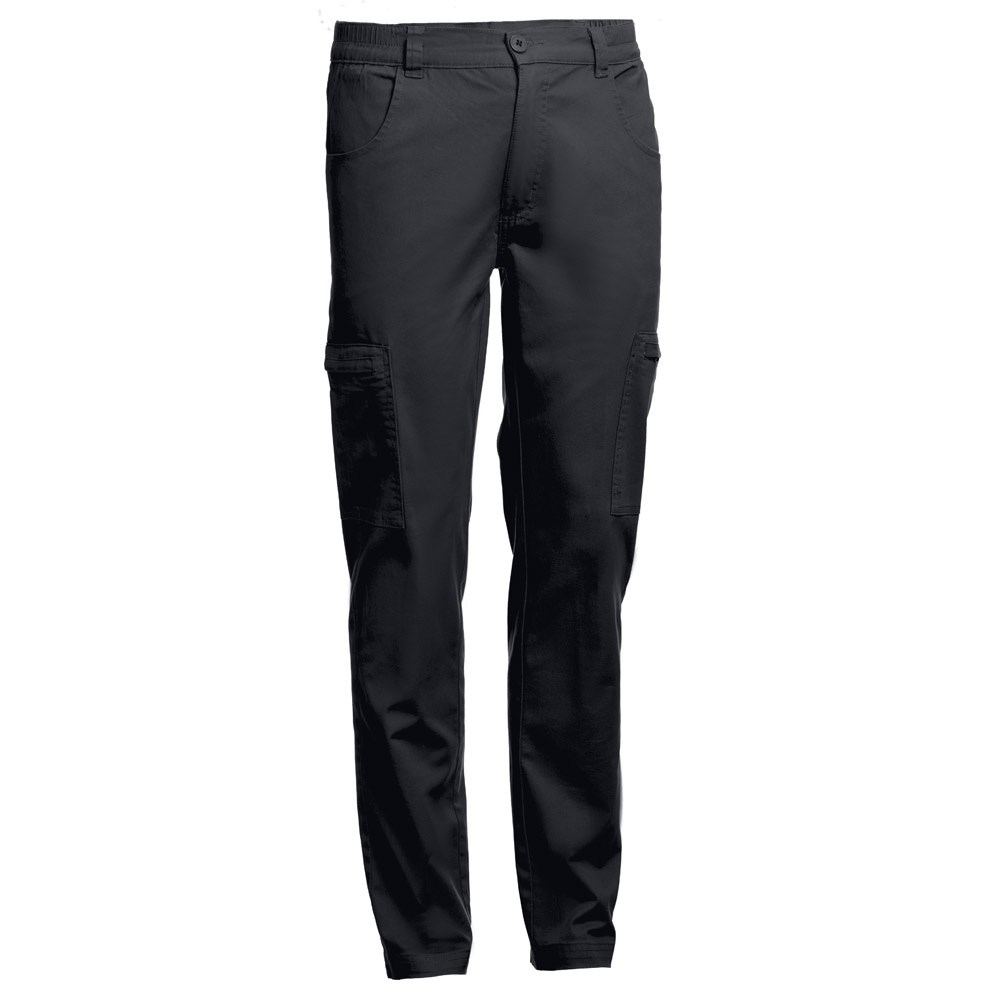 Arbeitshose aus 98% Baumwolle und 2% Elasthan (240g/m²). Diese Hose hat 6 Taschen: 2 seitliche Reißverschlusstaschen, 2 Fronttaschen und 2 Gesäßtaschen. Bund mit einem seitlichen und elastischen Band. Größen: S, M, L, XL, XXL, 3XL
