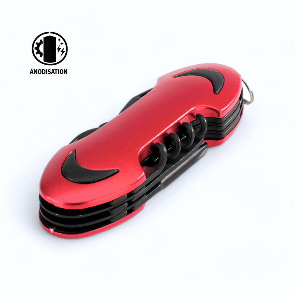 Taschenmesser Colorado aus eloxiertem Metall, das Zuverlässigkeit und Langlebigkeit garantiert. Besitzt einen eingebauten Korkenzieher, einen Flaschenöffner, einen Schraubendreher, eine Nagelfeile und eine Schere. Das Produkt ist in einer eleganten Schachtel verpackt.