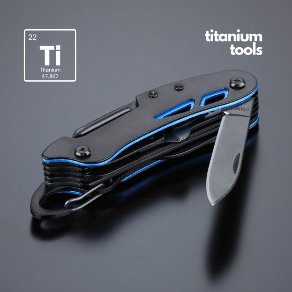 Optima-Taschenmesser im neuen Gewand, hergestellt aus hochwertigem Edelstahl mit Titanbeschichtung für verbesserte Härte und zusätzliche Korrosionsbeständigkeit. Bunte Einsätze am Griff zur dezenten Verzierung. Hauptmerkmale: Schere, Messer, Holzsäge, Flaschen- und Dosenöffner, Fischschaber, Korkenzieher, Locher (zum Durchstechen von z. B. einer Saftdose), Einfädler (zum Flicken von Schläuchen, Nähen von Segelflößen, Flicken eines Reifens), Nagelfeile, Kreuzschlitzschraubendreher. Das Taschenmesser mündet in einen Karabiner, sodass Sie es immer dabei haben können.
