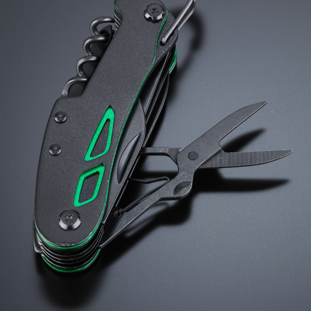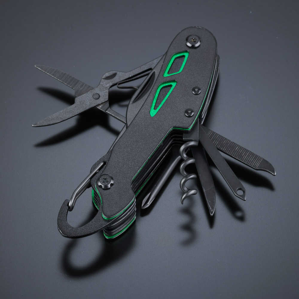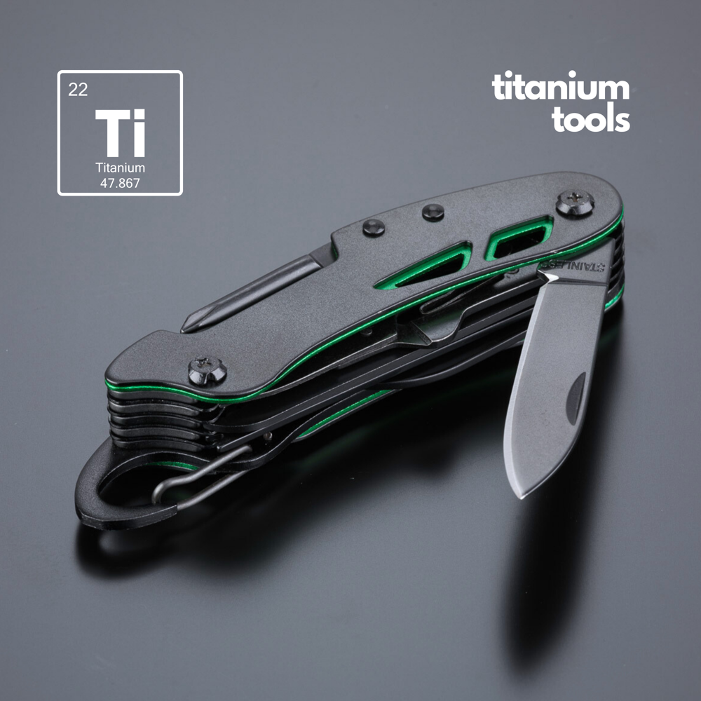 Optima-Taschenmesser im neuen Gewand, hergestellt aus hochwertigem Edelstahl mit Titanbeschichtung für verbesserte Härte und zusätzliche Korrosionsbeständigkeit. Bunte Einsätze am Griff zur dezenten Verzierung. Hauptmerkmale: Schere, Messer, Holzsäge, Flaschen- und Dosenöffner, Fischschaber, Korkenzieher, Locher (zum Durchstechen von z. B. einer Saftdose), Einfädler (zum Flicken von Schläuchen, Nähen von Segelflößen, Flicken eines Reifens), Nagelfeile, Kreuzschlitzschraubendreher. Das Taschenmesser mündet in einen Karabiner, sodass Sie es immer dabei haben können.