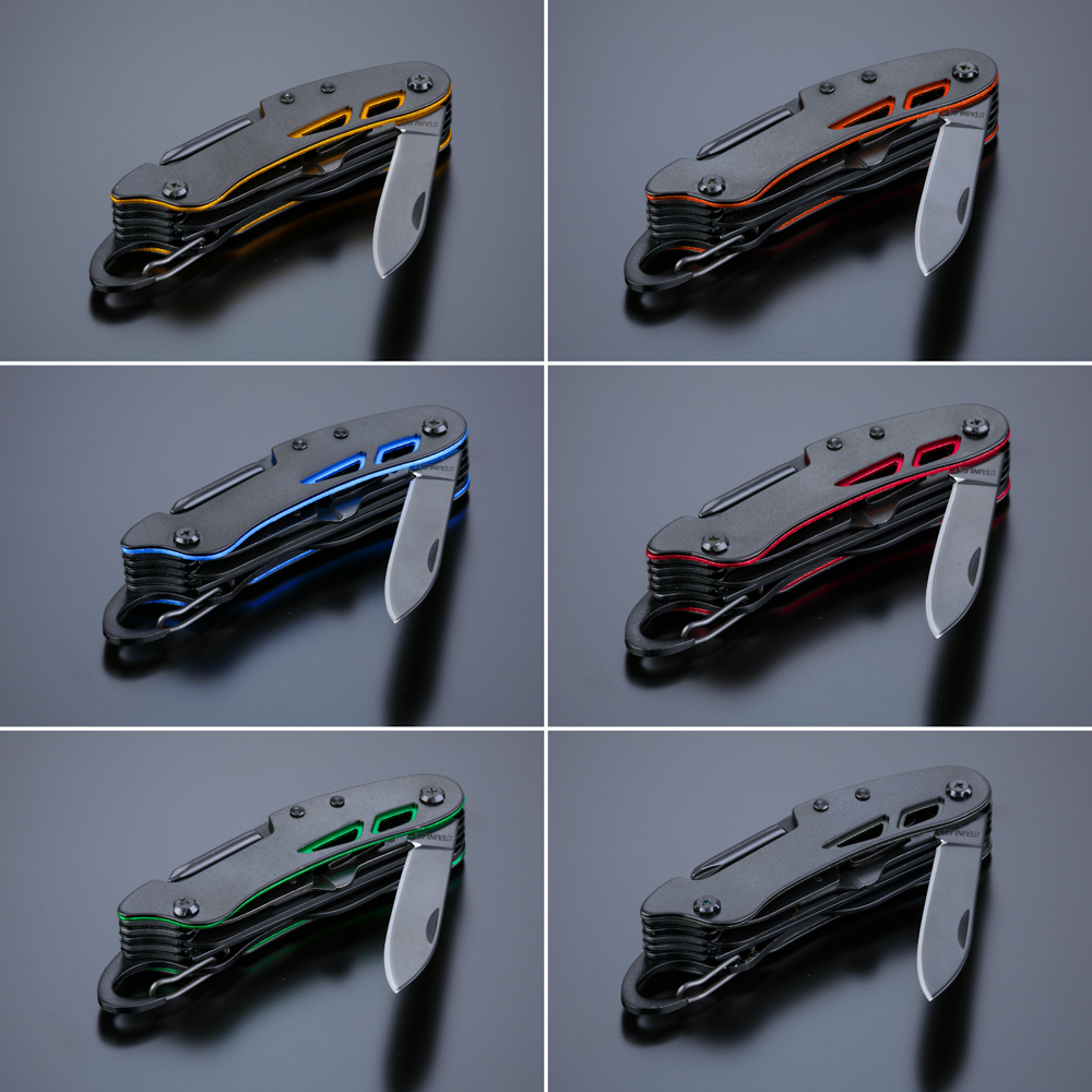 Optima-Taschenmesser im neuen Gewand, hergestellt aus hochwertigem Edelstahl mit Titanbeschichtung für verbesserte Härte und zusätzliche Korrosionsbeständigkeit. Bunte Einsätze am Griff zur dezenten Verzierung. Hauptmerkmale: Schere, Messer, Holzsäge, Flaschen- und Dosenöffner, Fischschaber, Korkenzieher, Locher (zum Durchstechen von z. B. einer Saftdose), Einfädler (zum Flicken von Schläuchen, Nähen von Segelflößen, Flicken eines Reifens), Nagelfeile, Kreuzschlitzschraubendreher. Das Taschenmesser mündet in einen Karabiner, sodass Sie es immer dabei haben können.