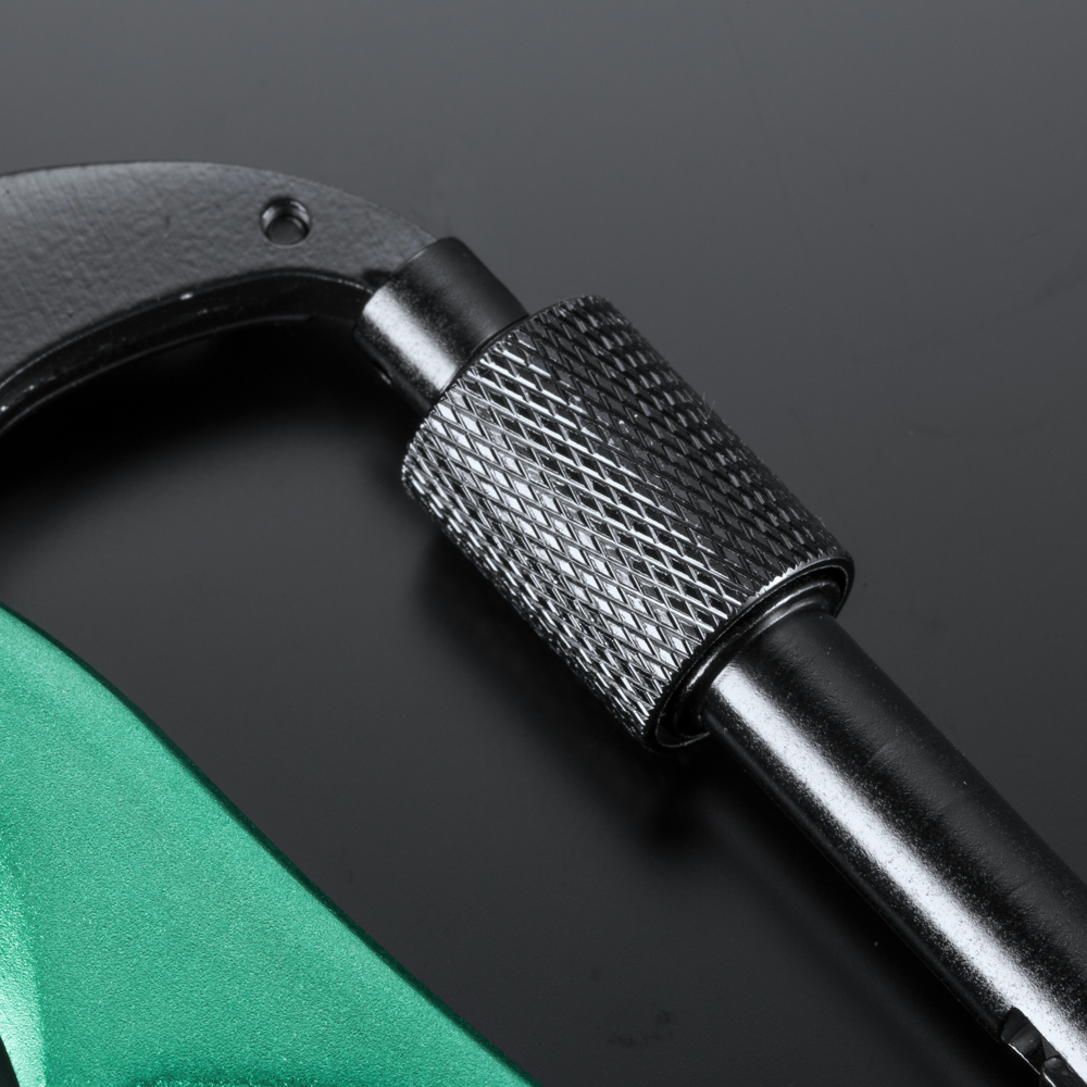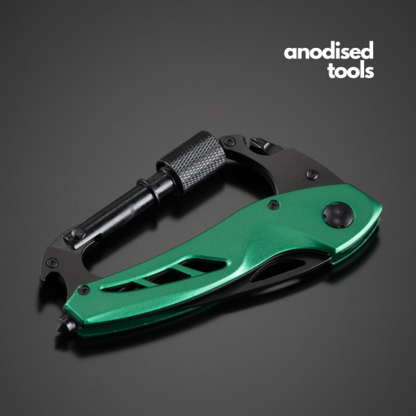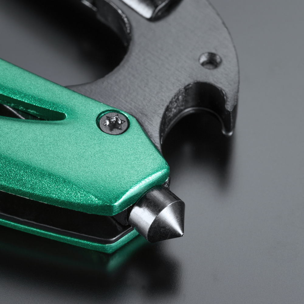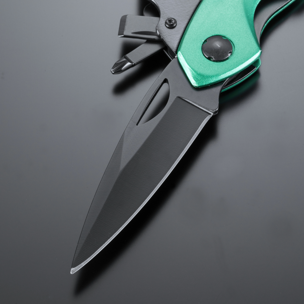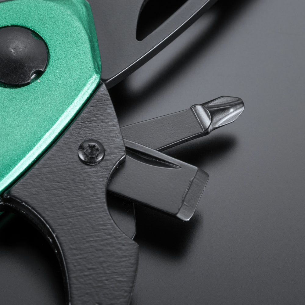 Ein scharfes Edelstahlmesser, Schlitz- und Kreuzschlitzschraubendreher-Bits, Bügelgriff, Glasbrecher, Flaschenöffner. Faltbar, kann an Hose oder am Rucksack befestigt werden. Die Klinge besteht aus hochwertigem, schwarz eloxiertem Edelstahl. Der Metallkörper ist farbig eloxiert und mit großem Karabinerhaken ausgestattet.
