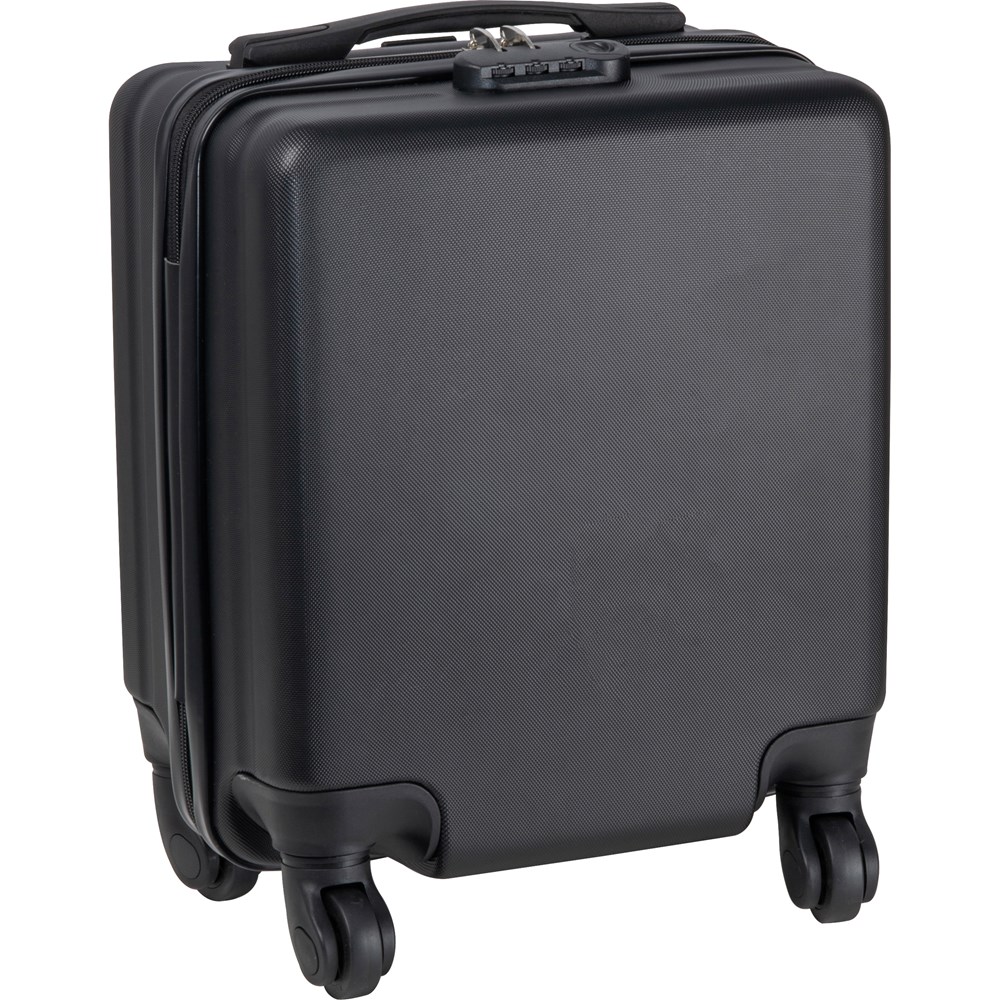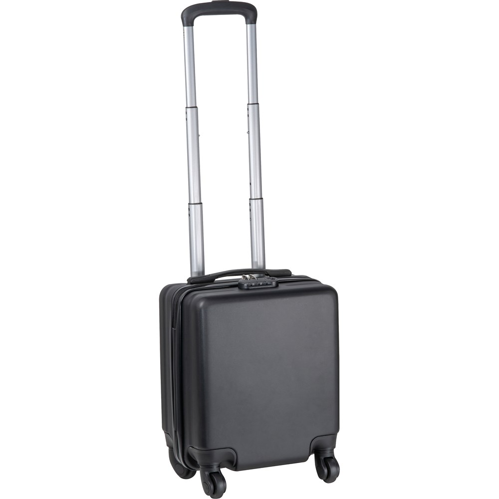 Schwarzer Trolley, der ideal unter den Sitz im Flugzeug passt. Mit Platz für Laptops bis zu 14 Zoll und zusätzlichem Stauraum für persönliche Gegenstände. Perfekt für Geschäftsreisen oder Wochenendtrips – funktional, stilvoll und bequem. Ihr Logo platzieren wir vorne auf dem Trolley.