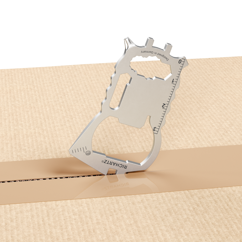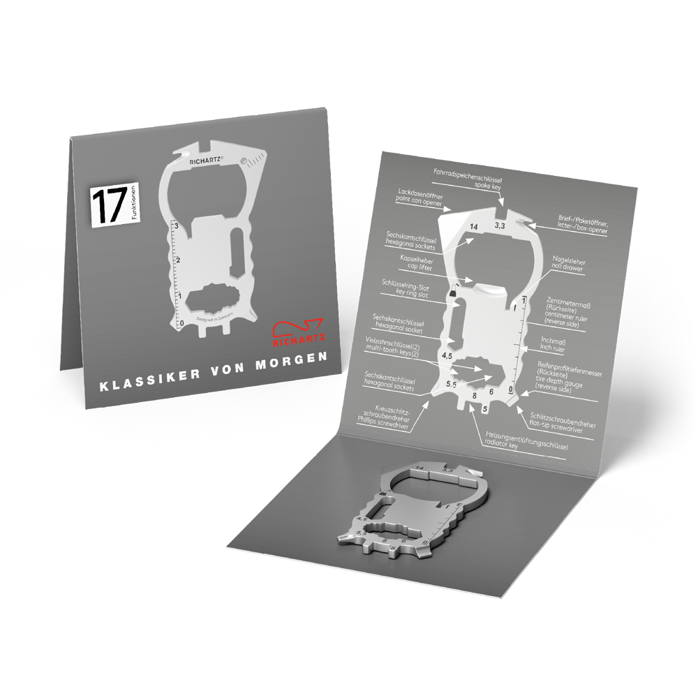 RICHARTZ KEY TOOL® compact work ist der erfolgreiche Werbeträger für Marken und Unternehmen. Mit einer individuellen Lasergravur und individuell gestalteter 4-seitigen Verpackung in 4c, werben Marken aufmerksamkeitsstark und aussagekräftig!