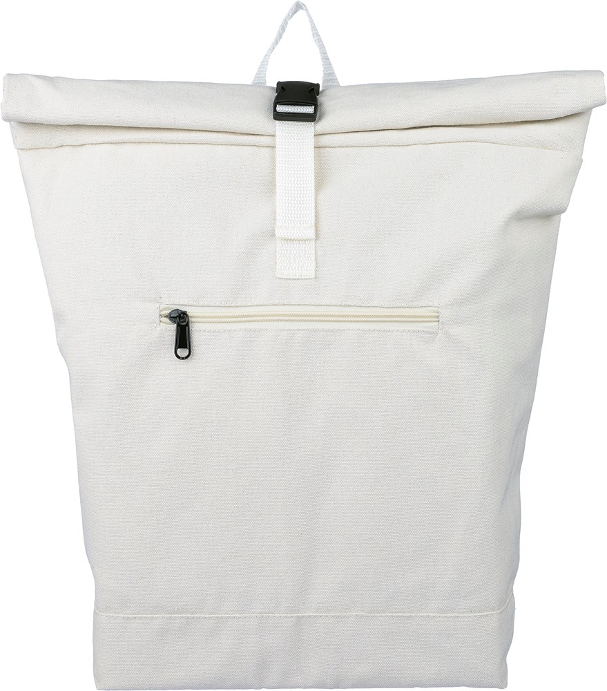 Rolltop-Rucksack aus recyceltem Poly-Baumwollgewebe (330 g/m2) mit 210D-Polyesterfutter und Kunststoffschnallenverschluss. Er hat ein Fassungsvermögen von 15 Litern, ein großes Reißverschlussfach mit einem 15”-Laptopfach, zwei Innenfächer und ein Außenfach. Zur Ausstattung gehören eine Trageschlaufe oben, gepolsterte, verstellbare Schultergurte und eine kleine Fronttasche mit Reißverschluss. Tragfähigkeit: 14 kg. Inklusive Etikett.