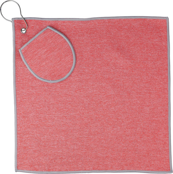 Golfhandtuch aus rPET mit integrierter Golfballtasche, ca. 31 x 31 cm. Mit Metallhaken zur einfachen Befestigung an der Golftasche und rPET-Etikett auf der Innenseite. Maschinenwaschbar (kalt).