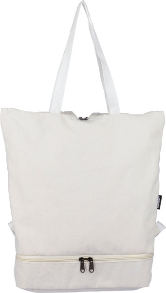 Rucksack aus recyceltem Poly-Baumwollgewebe (330 g/m2) mit 210D-Polyesterfutter. Mit einem großen Reißverschlussfach oben, einem Reißverschlussfach unten, zwei Innenfächern und einem Außenfach mit Reißverschluss. Lange Tragegriffe und gepolsterter, verstellbarer Schultergurt. Fassungsvermögen: 30 Liter. Tragkraft: 15 kg. Inklusive Etikett.