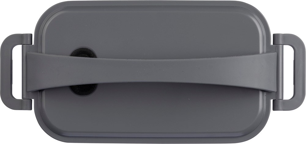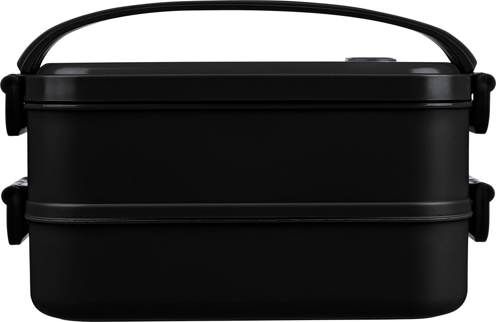 Lunchbox aus PP mit einem Gesamtfassungsvermögen von 1600 ml, aufgeteilt in zwei Schichten zu je 800 ml. Mit mikrowellengeeignetem Silikonventil, Schnappverschluss und Tragegriff aus Silikon. In Großpackungen verpackt.