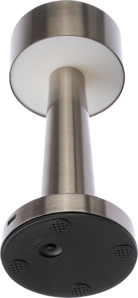 Tischleuchte aus Metall und ABS mit 24 LEDs und drei Lichtmodi (weiß, neutral, warm), die über einen Berührungssensor an der Oberseite gesteuert werden. Inklusive 800 mAh Akku und Ladegerät Typ C mit 1 m Kabel. Die Lampe ist dimmbar und verfügt über einen Ein-/Ausschalter an der Unterseite. Einzeln verpackt in braunem Karton.