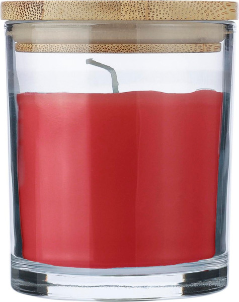 Glaskerze mit 120g gefärbtem Wachs und Vanilleduft in einem durchsichtigen Glasbehälter mit Bambusdeckel. Brenndauer ca. 20 Stunden. Einzeln verpackt in weißer Pappröhre.