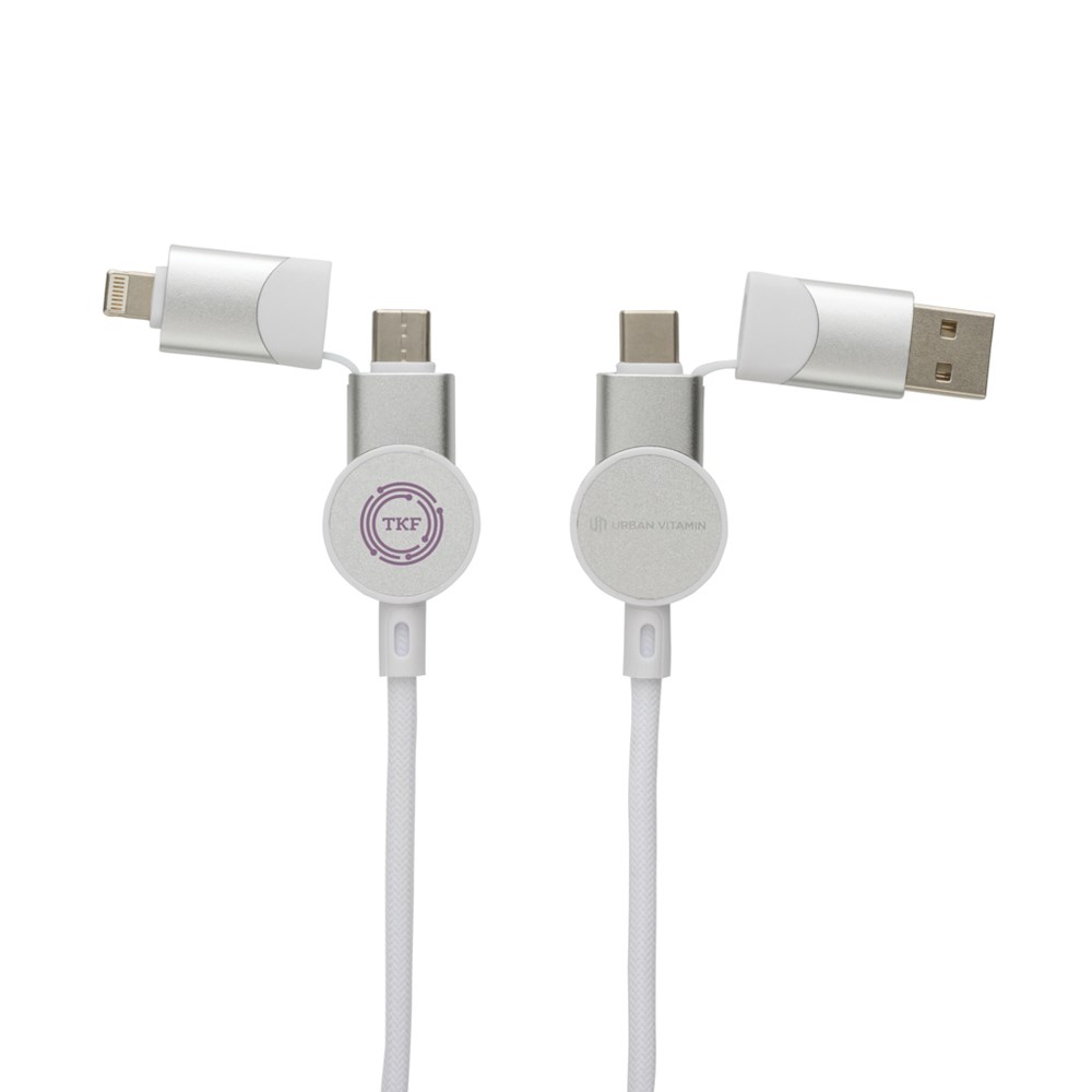 Das Gehäuse des Schnellladekabels Oakland besteht aus 100% RCS-zertifiziert recyceltem TPE & Aluminium, das Kabel aus 100% recyceltem TPE-Innen und 100% recycelter PET-Außenschicht. RCS (Recycled Claim Standard) ist ein Standard zur Überprüfung des Recyclinganteils eines Produkts in der gesamten Lieferkette. Dieser Standard wird verwendet, wenn ein Teil des Artikels aus recycelten Materialien hergestellt wurde. 120cm langes Kabel mit 5 verschiedenen Anschlüssen: USB-C In,USB-A In,Typ-C Out,IOS Out und Micro USB Out. Daher auch mit Typ-C Ausgabegeräten verwendbar, wie z.B. neueren Generation von Telefonen und MacBook-Computern. Die USB-A-In/Out-Option sorgt dafür, dass man jedes Gerät von jeder Ausgangsquelle aufladen kann. Maximale Spannung von Typ-C zu Typ-C sind 45W. Urban Vitamin Artikel werden ohne PVC hergestellt. Die Verpackung mit besonders wenig Kunststoff verpackt. Gesamter Recyclinganteil: 52% bezogen auf das Gesamtgewicht des Artikels. Kann Laden und Synchronisieren.