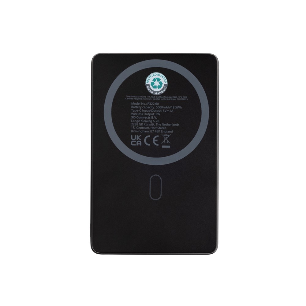 Ultradünne 5.000mAh Powerbank mit magnetischem, kabellosem 5W-Ladegerät, bei der das Gehäuse aus RCS-zertifiziert recyceltem Aluminium und recyceltem ABS-Kunststoff hergestellt ist. RCS (Recycled Claim Standard) ist ein Standard zur Überprüfung des Recyclinganteils eines Produkts über die gesamte Lieferkette hinweg. Recycelter Gesamtanteil: 23%, bezogen auf das Gesamtgewicht des Artikels. Die Powerbank enthält einen langlebigen 5.000mAh-A-Grade Lithium-Polymer-Akku. Die Ladestandsanzeige zeigt den verbleibenden Energiestand an, damit Sie immer wissen, wann Sie wieder aufladen müssen. Type-C-Input: 5V/2,4A; USB-C-Output: 5V/2A.4A. Artikel und Zubehör sind PVC-frei. Inklusive RCS-zertifiziert recyceltem TPE-Ladekabel. Verpackt in FSC®-Mix-Verpackung.