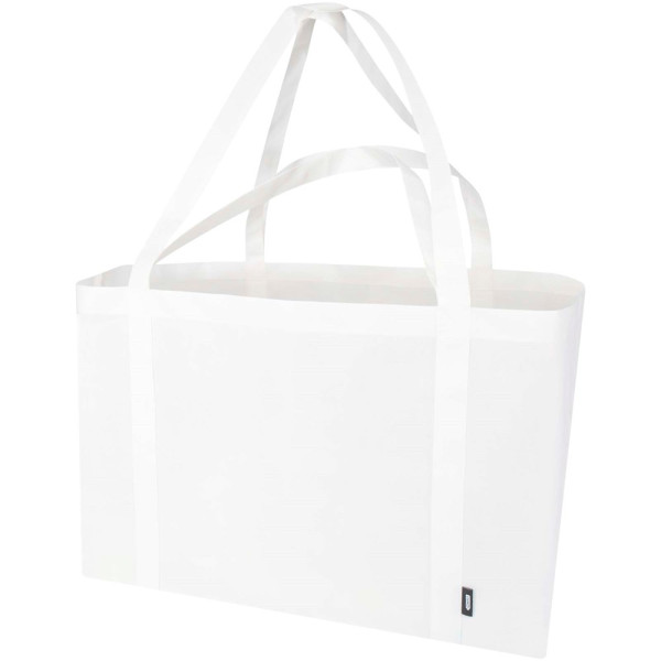 Die Jumbo Tragetasche aus GRS-zertifiziertem Recyclingmaterial besteht aus strapazierfähigem und reißfestem RPET-Non Woven und bietet mit bis zu 65 Litern ein extra großes Fassungsvermögen für vielfältige Aktivitäten wie den Großeinkauf oder einen Tag am Strand oder im Park. Mit verstärkten kurzen (24 cm) und langen (37 cm) Griffen für maximalen Tragekomfort. Bei Nichtgebrauch lässt sie sich leicht zusammenfalten und verstauen. Beständigkeit bis zu 15 kg.