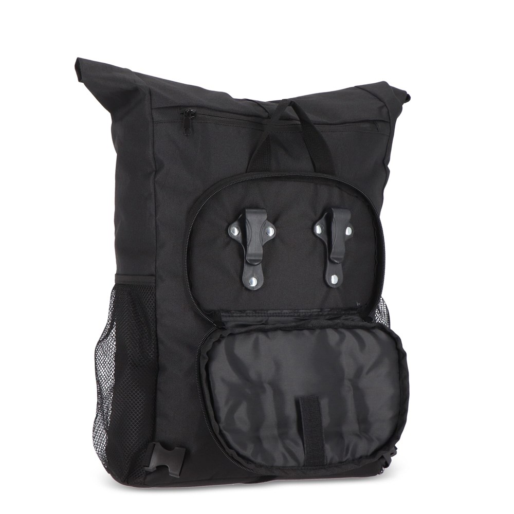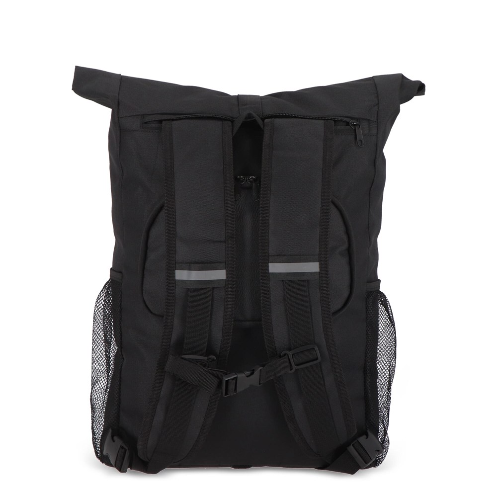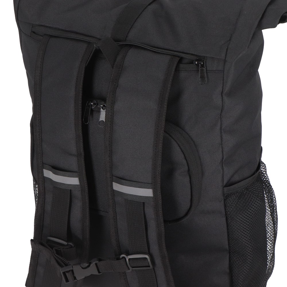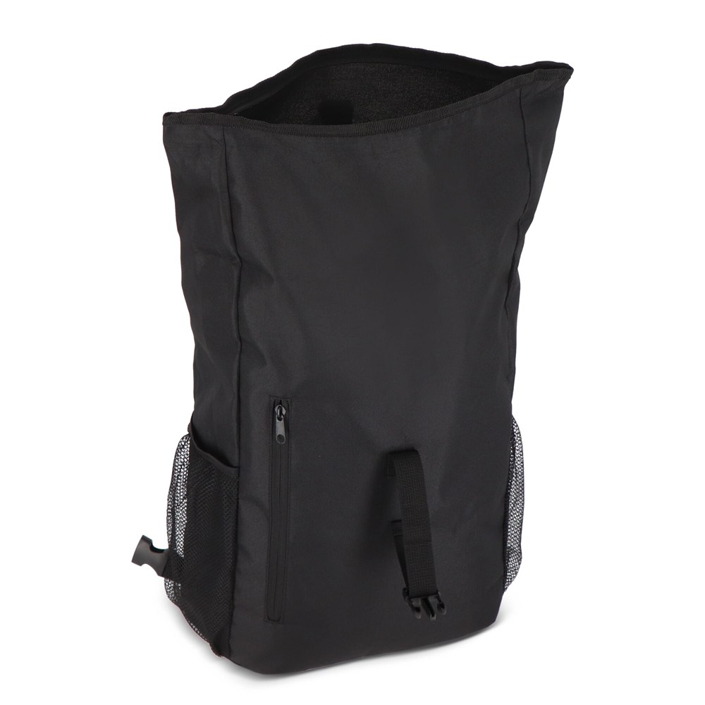 Diese Fahrradtasche im trendigen Rolltop-Design ist aus recyceltem PET hergestellt. Sie verfügt über eine Reißverschlusstasche oben und eine Vordertasche, einen Griff oben, verstellbare, gepolsterte, abnehmbare Schultergurte und zwei Clips, um die Tasche beim Radfahren am Fahrrad zu befestigen. Die beiden seitlichen Netztaschen sind ideal für Wasserflaschen oder Regenschirme.