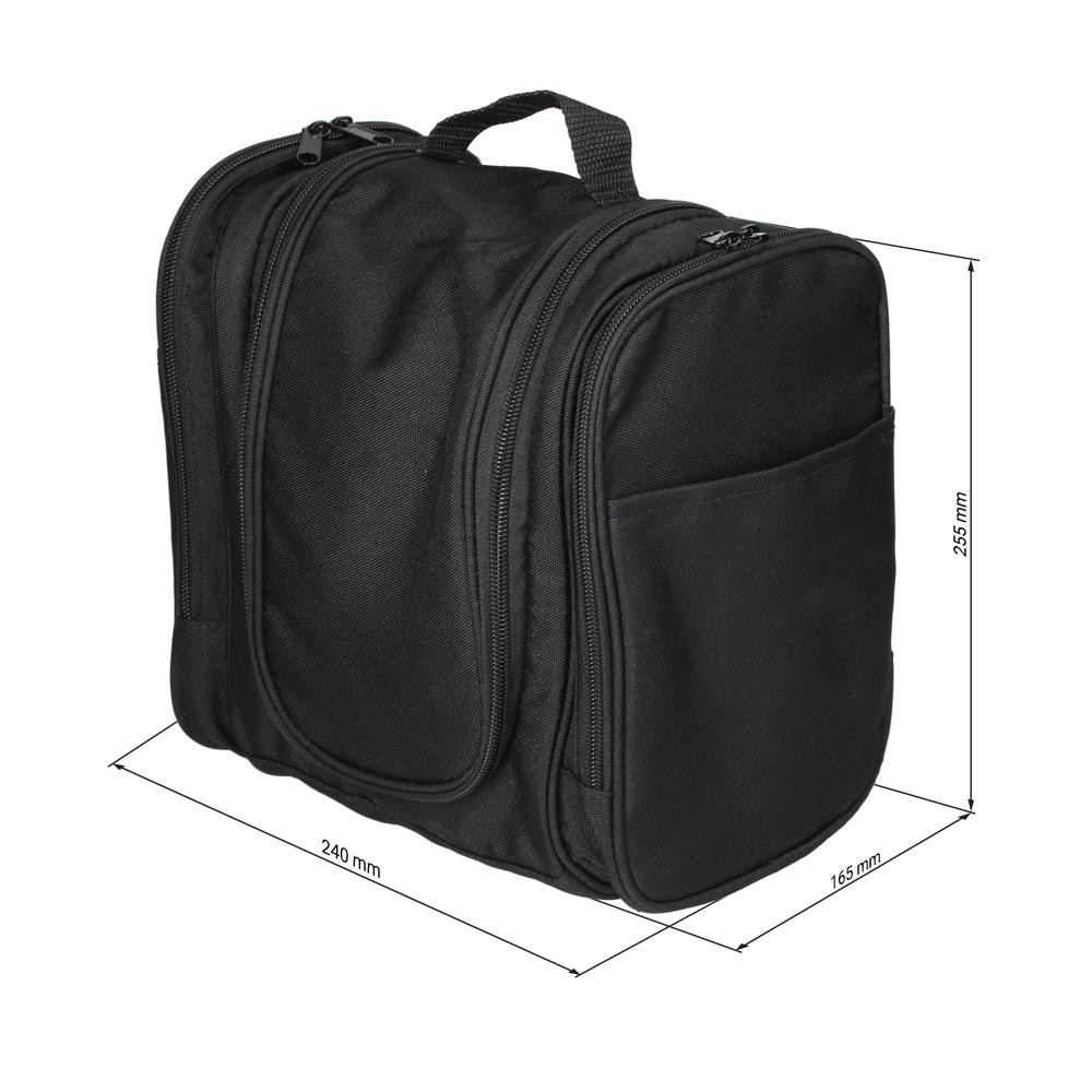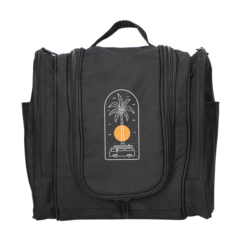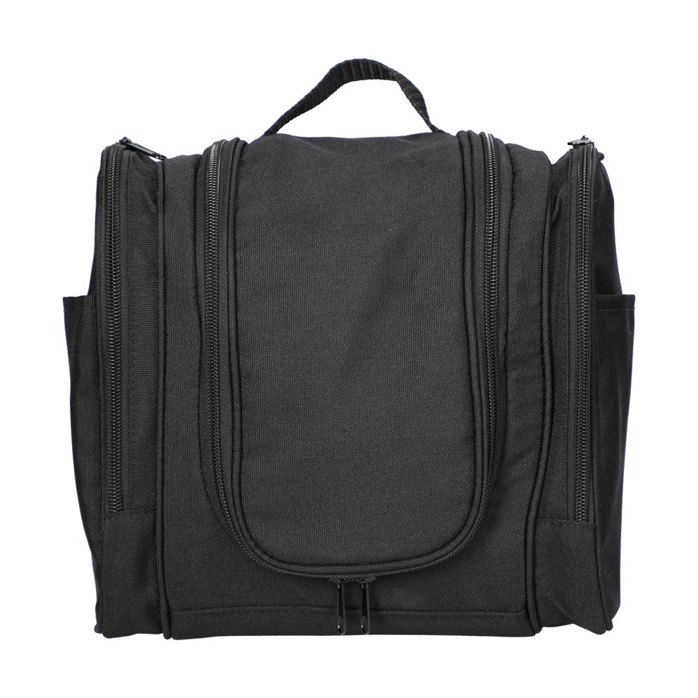 Schwarzer Kulturbeutel aus Polyester mit reichlich Platz. Der Kulturbeutel überzeugt mit einem großem Hauptfach, das fünf Netzfächern als auch ein oberes Netzfach mit Reißverschluss sowie Haken zum Aufhängen beinhaltet. Des Weiteren gibt es zwei weitere Außentaschen, die je ein weiteres Netzfach und integrierte Gummilaschen für z.B. Utensilien wie Zahnbürsten etc. enthalten. Der große Tragegriff am Kulturbeutel und die kleinen seitlichen Henkel, sorgen für einen angenehmen Tragekomfort.