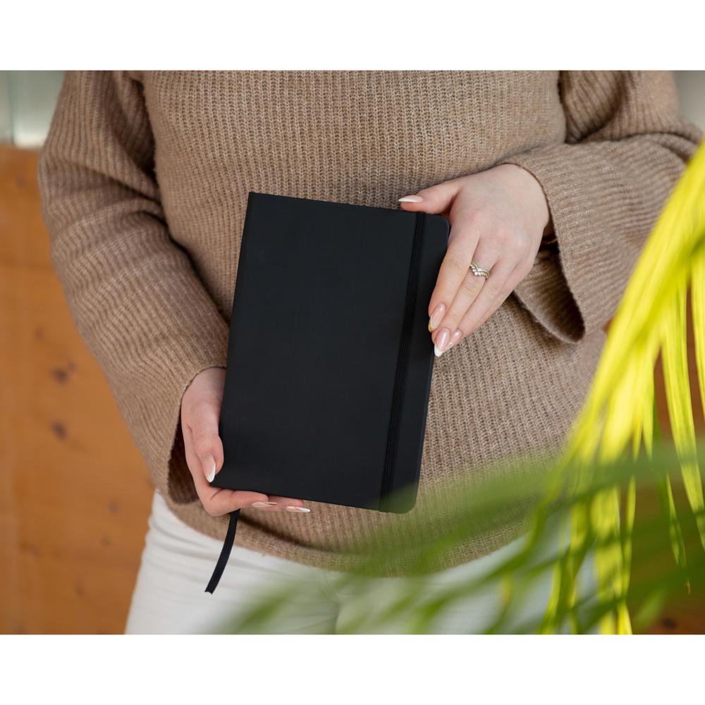 Das Notizbuch "Textura" im praktischen A5-Format bietet eine stilvolle und funktionale Lösung für alle Notizen. Mit einem strapazierfähigen Einband aus PU-PVC in klassischem Schwarz überzeugt es durch eine elegante Optik und langlebige Qualität. Die punktierten Seiten ermöglichen präzises Schreiben und Skizzieren, während das integrierte Lesezeichen dafür sorgt, dass man wichtige Notizen stets schnell wiederfinden. Mit seinen Maßen von 21 x 14,5 cm ist es groß genug für ausführliche Notizen und gleichzeitig kompakt genug für den täglichen Gebrauch.