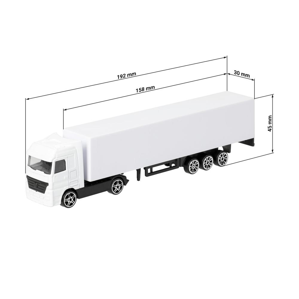 Miniaturtruck im Maßstab 1:87 mit vielen Details. Sonderfarben auf Anfrage. Zugmaschine aus Metallspritzguss und Auflieger aus Kunststoff. Verpackt im Einzelkarton mit Sichtfenster. Perfekt für Sammler und Modellbau-Enthusiasten.