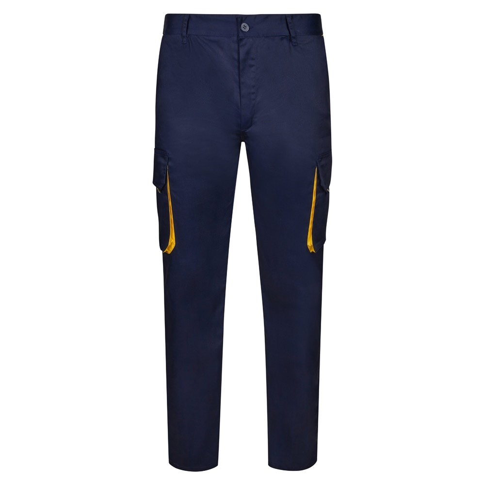 Zweifarbige Twill-Hose mit mehreren Taschen (200 g/m²), aus Baumwolle (35%) und Polyester (65%). Mit elastischem Bund und kontrastierenden Farben an den Zwickeln, Zugbändern und Nähten. Enthält sechs Taschen: (2 französische Taschen, 2 seitliche Zwickeltaschen und 2 Gesäßzwickeltaschen). Größe: 34, 36, 38, 40, 42, 44, 46, 48, 50, 52, 54, 56, 58, 60
