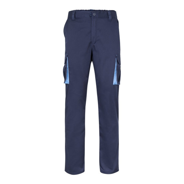 Zweifarbige Twill-Hose mit mehreren Taschen (200 g/m²), aus Baumwolle (35%) und Polyester (65%). Mit elastischem Bund und kontrastierenden Farben an den Zwickeln, Zugbändern und Nähten. Enthält sechs Taschen: (2 französische Taschen, 2 seitliche Zwickeltaschen und 2 Gesäßzwickeltaschen). Größe: 34, 36, 38, 40, 42, 44, 46, 48, 50, 52, 54, 56, 58, 60
