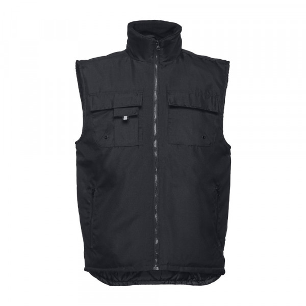 Herren Arbeitsweste aus 100% Polyester mit Acrylbeschichtung (170g/m²), gepolstert und gefuttert. Innenseite aus 100% Polyester-Taft (65g/m²) mit Polar Fleece Kragen. Die Weste hat 6 Taschen, 5 Taschen auf der Vorderseite davon 2 Taschen mit Reißverschluss, 1 Tasche für das Handy und 1 Innentasche. Elastisches Band an den Seiten. Der Reißverschlusszugang auf der Rückseite vereinfacht die Veredelung. Größen: S, M, L, XL, XXL, 3XL