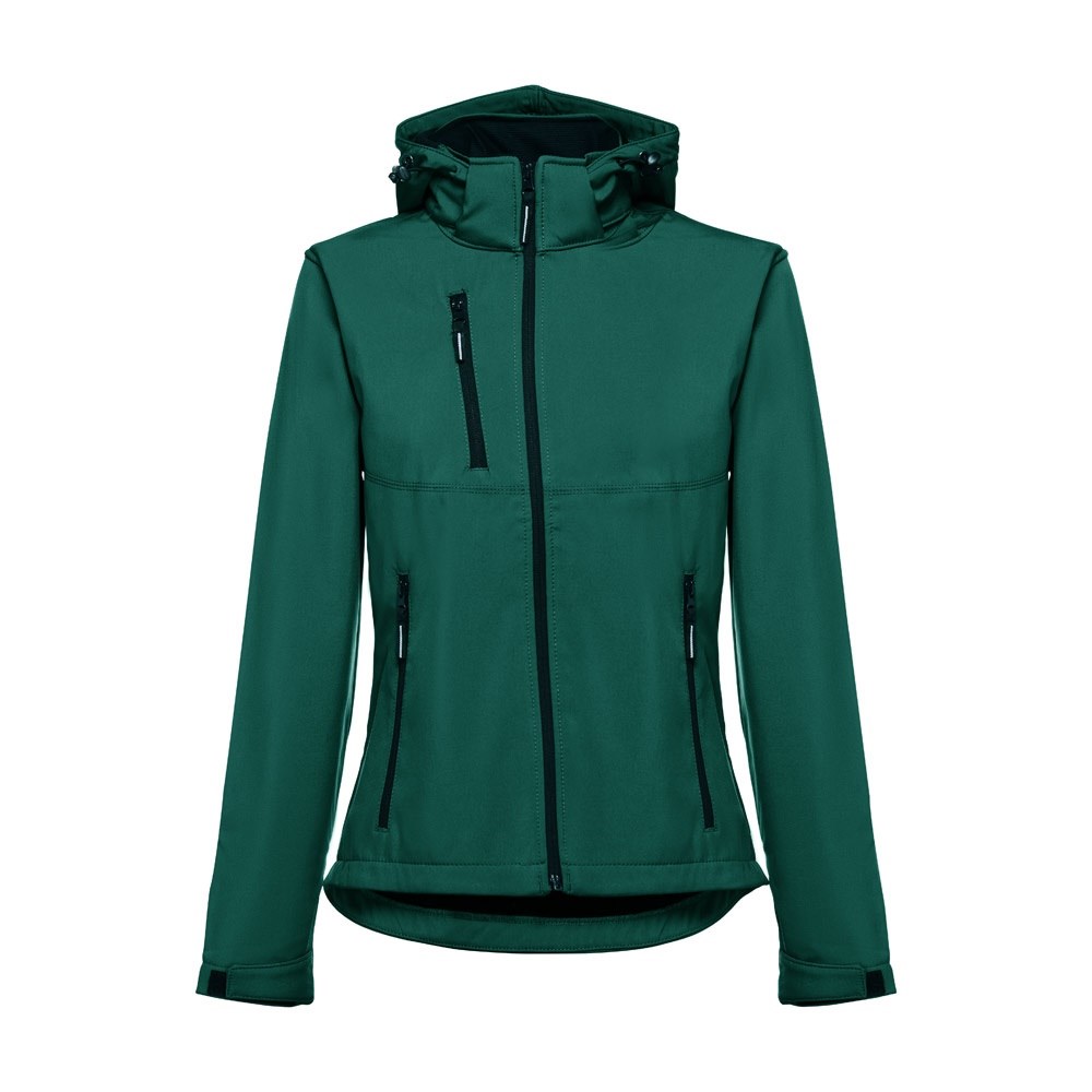 Damen Softshell Jacke aus 96% Polyester und 4% Elasthan (280g/m²) mit abnehmbarer, wasserabweisender und zweischichtiger Kapuze. Diese Jacke ist mit Fleecefutter ausgestattet, hat 2 Vordertaschen mit Reißverschluss und eine diagonale Brusttasche. Auch hat diese verstellbare Ärmelbündchen mit Klettverschluss, eine abnehmbare Kapuze mit Kordelzug, einen verstellbaren Stopper und Klettverschluss. Abgerundete Rückenseite. Größen: S, M, L, XL, XXL