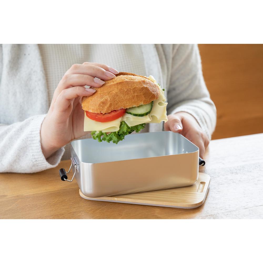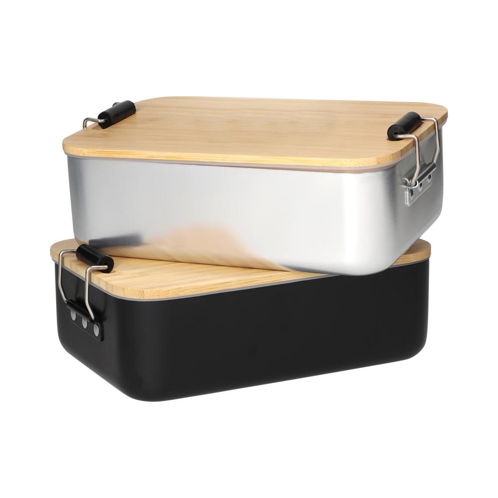 Plastikfreie Brotzeitbox für Ihre Promotion. Die Dose besteht aus Aluminium, der Deckel ist aus Bambusholz und verfügt über einen Silikonring und Klemmbügel für ein sicheres Verschließen. Der Deckel ist komplett abnehmbar und kann bei Bedarf auch als Schneidbrett verwendet werden.