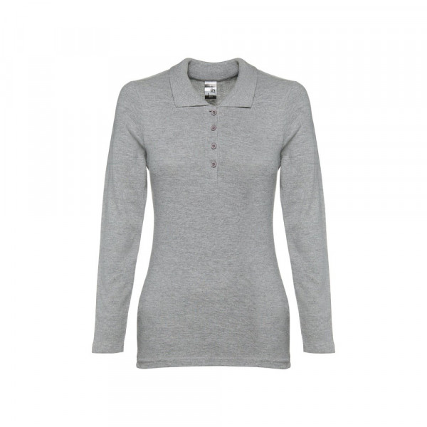 Damen langarm Poloshirt aus Piqué Stoff 100% kardierter Baumwolle (210g/m²) mit geripptem Kragen und Ärmelbund, Verstärkungsband am Kragen und verstärkte Knopfleiste mit 4 farblich abgestimmten Knöpfen und mit einem Ersatzknopf an der Innennaht. Unten mit seitlichen Öffnungen. Bei der Farbe 183 bestehend aus 85% Baumwolle und 15% Viskose. Etikett ist abreissbar. Größen: S, M, L, XL, XXL