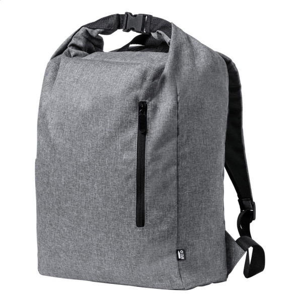 Wasserfester Rolltop-Rucksack aus RPET mit Seitentasche, Reißverschluss-Vorderfach und ergonomischen Rücken und Schultergurten. Material: 300D RPET Polyester, mit abtrennbarem RPET-Label.